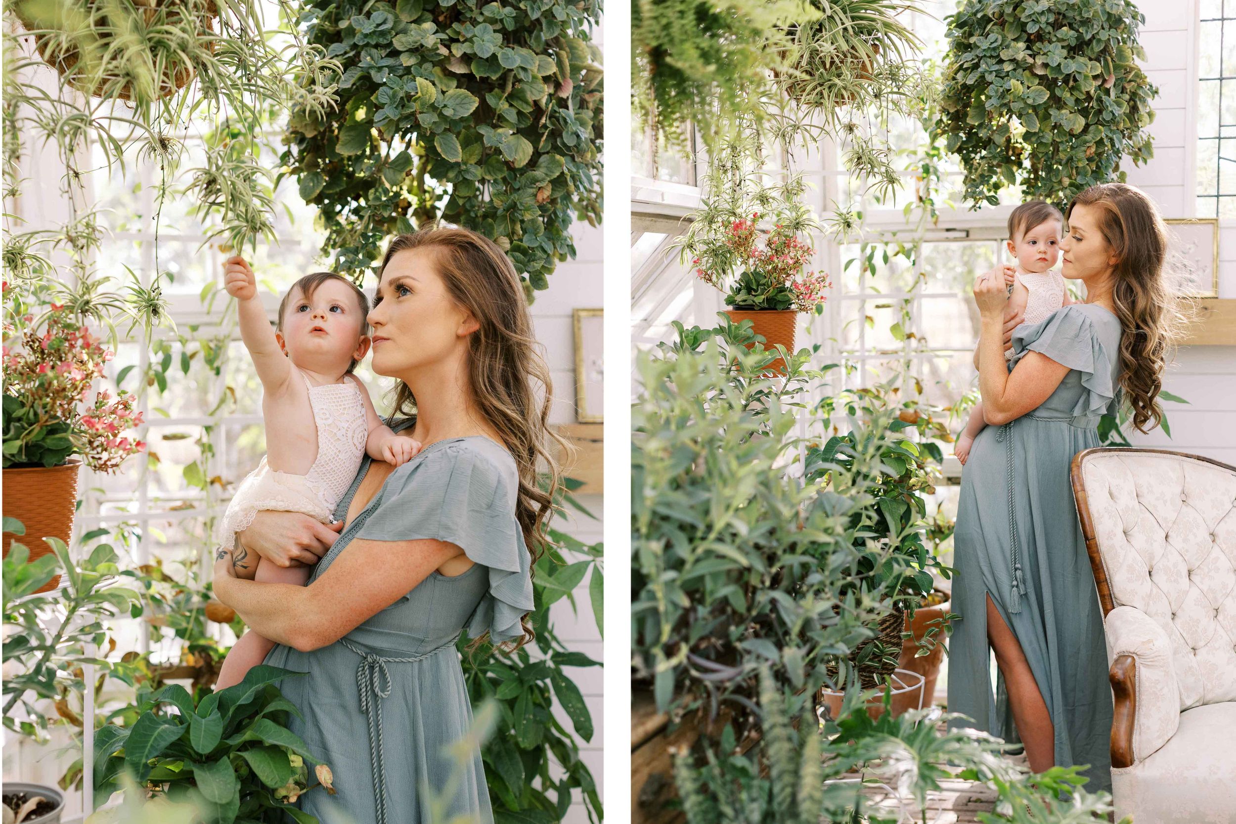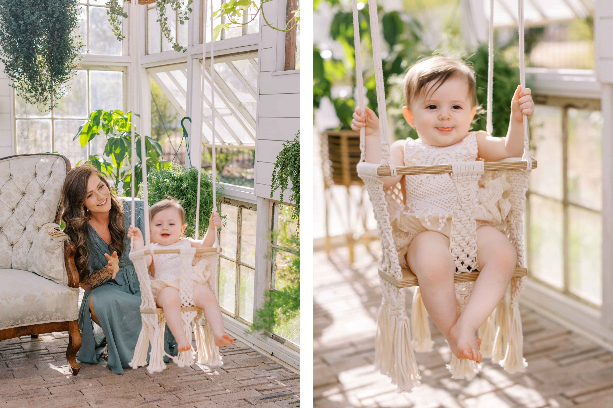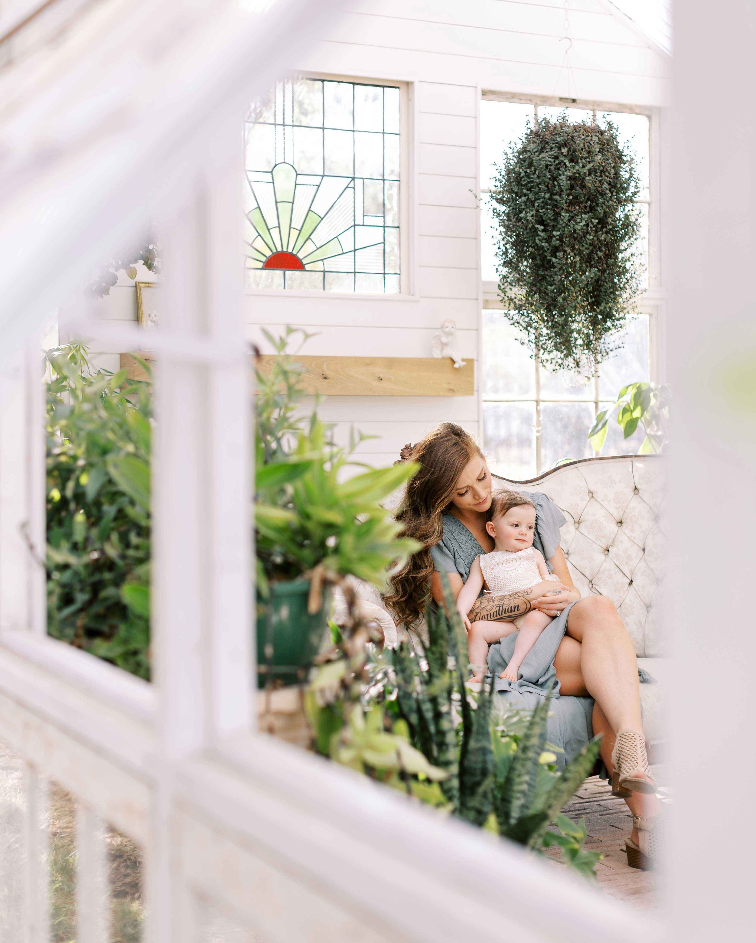 Miranda’s session was at a private greenhouse on the southside of San Antonio. The greenhouse has a boho feel with plants abound, a vintage Victorian couch, swing for the little ones, beautiful light shining through, and an atmosphere that feels a little magical.